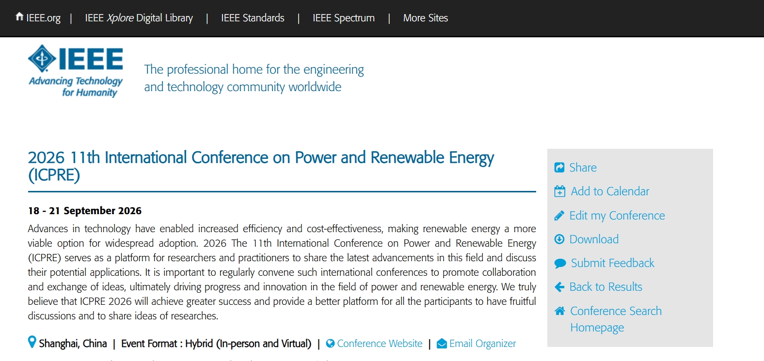 After the success of 2025, The 11th International Conference on Power and Renewable Energy, the annual premier power and renewable energy development meeting, will be held from September 18-21, 2026 in Shanghai, China. ICPRE 2026 is co-sponsored by Shanghai University of Electric Power, Shanghai Jiao Tong University, Shanghai University, hosted by College of Automation Engineering, Shanghai University of Electric Power.